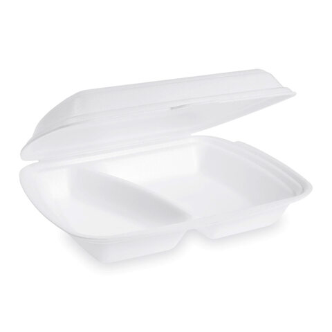 Diese zweiteilige Menüklappbox ist die ideale Außer-Haus-Schale aus geschäumtem PS. Sie hat sehr gute isolierende Eigenschaften und bietet eine gute Festigkeit.