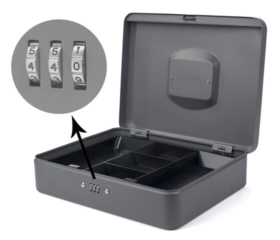 Geldkassette aus robustem Stahl, mit Zahlenschloss und herausnehmbaren Münzfächern, 300 mm