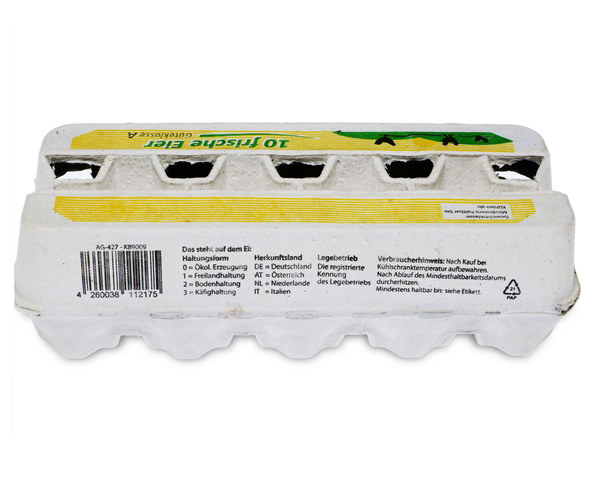 - auf der Vorderseite befindet sich nochmals der Aufdruck "10 frische Eier" sowie der Hinweis "Güteklasse A"