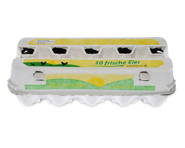 - Deckel enthält färbiges "Eier"-Motiv, den Aufdruck "10 frische Eier" und wichtige Verbraucherinformationen ("Gewichtsklasse", "Mindestens baltbar bis", "Kühlen ab")